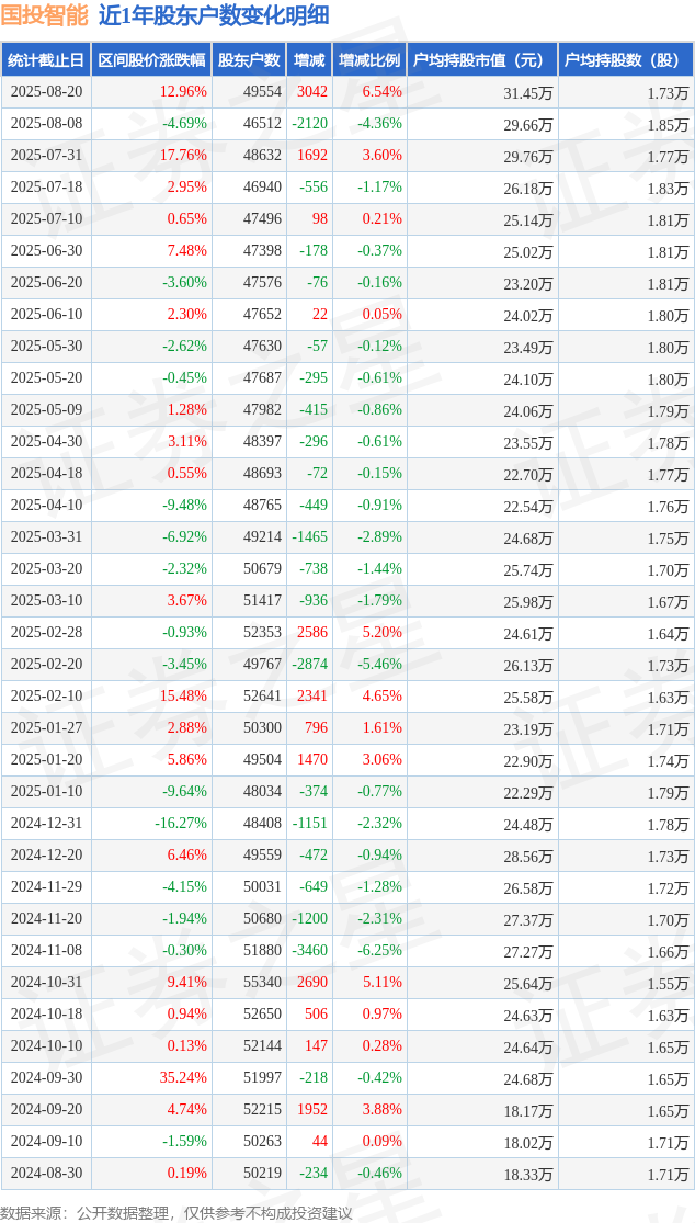 从股价来看,2025年8月8日至2025年8月20日,国投智能区间涨幅为12.96%,在此期间股东户数增加3042.0户,增幅为6.54%。