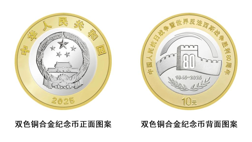 双色铜合金纪念币背面主景图案为中国人民抗日战争暨世界反法西斯战争胜利80周年纪念活动标识,并刊“中国人民抗日战争暨世界反法西斯战争胜利80周年”字样及面额“10元”字样。发行数量为8000万枚。
