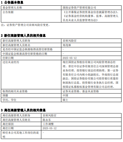 国投证券资管任命郑茂林为首席风险官 陈永东离