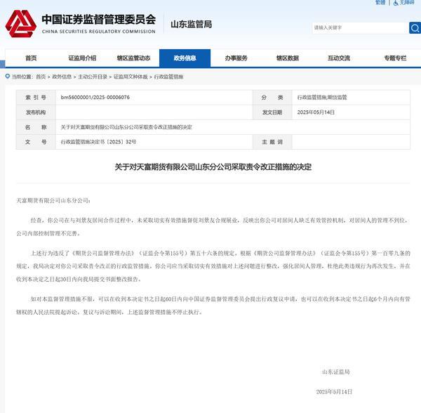 山东证监局要求,天富期货山东分公司应当采取切实有效措施对上述问题进行整改,强化居间人管理,杜绝此类违规行为再次发生,并在收到本决定之日起30日内向山东证监局提交书面整改报告。以下是相关行政监管措施正文: