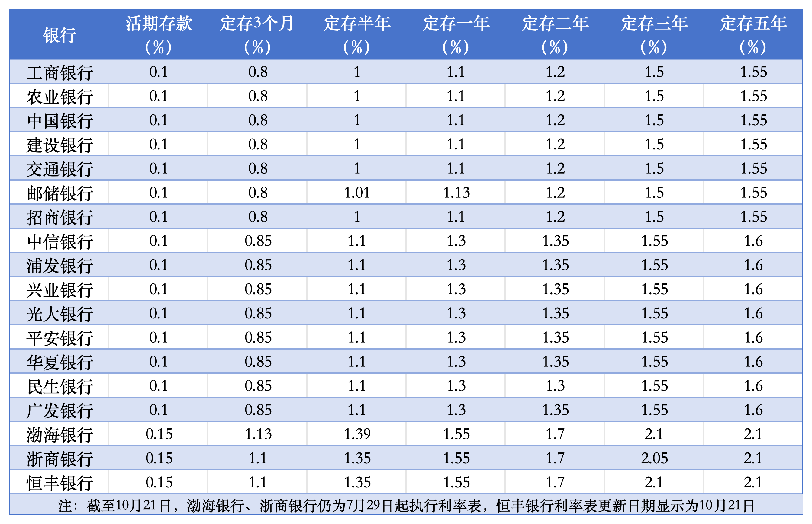 10月18日以来,多数股份行已经跟进国有大行,对不同品种的存款利率进行了新一轮调整,其中,招商银行在18日与大行同步调整,平安银行则在19日更新了利率表,21日又有中信银行、浦发银行、兴业银行、光大银行、华夏银行、民生银行、广发银行更新了利率表,其他,恒丰银行、浙商银行、渤海银行尚未跟进更新。